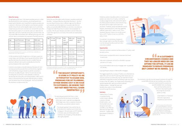 Customer conversations should emphasise the peace of mind and reassurance this provides them and their family, together with the flexibility and guaranteed insurability it provides in the future. Inevitably though, it will turn to cost and one way of making the new premium more palatable, could be to demonstrate the saving they are making between a WOL and CT policy, or the value the sum assured under the policy is adding over and above the premiums being paid – the Zurich whole of life calculator can demonstrate this.